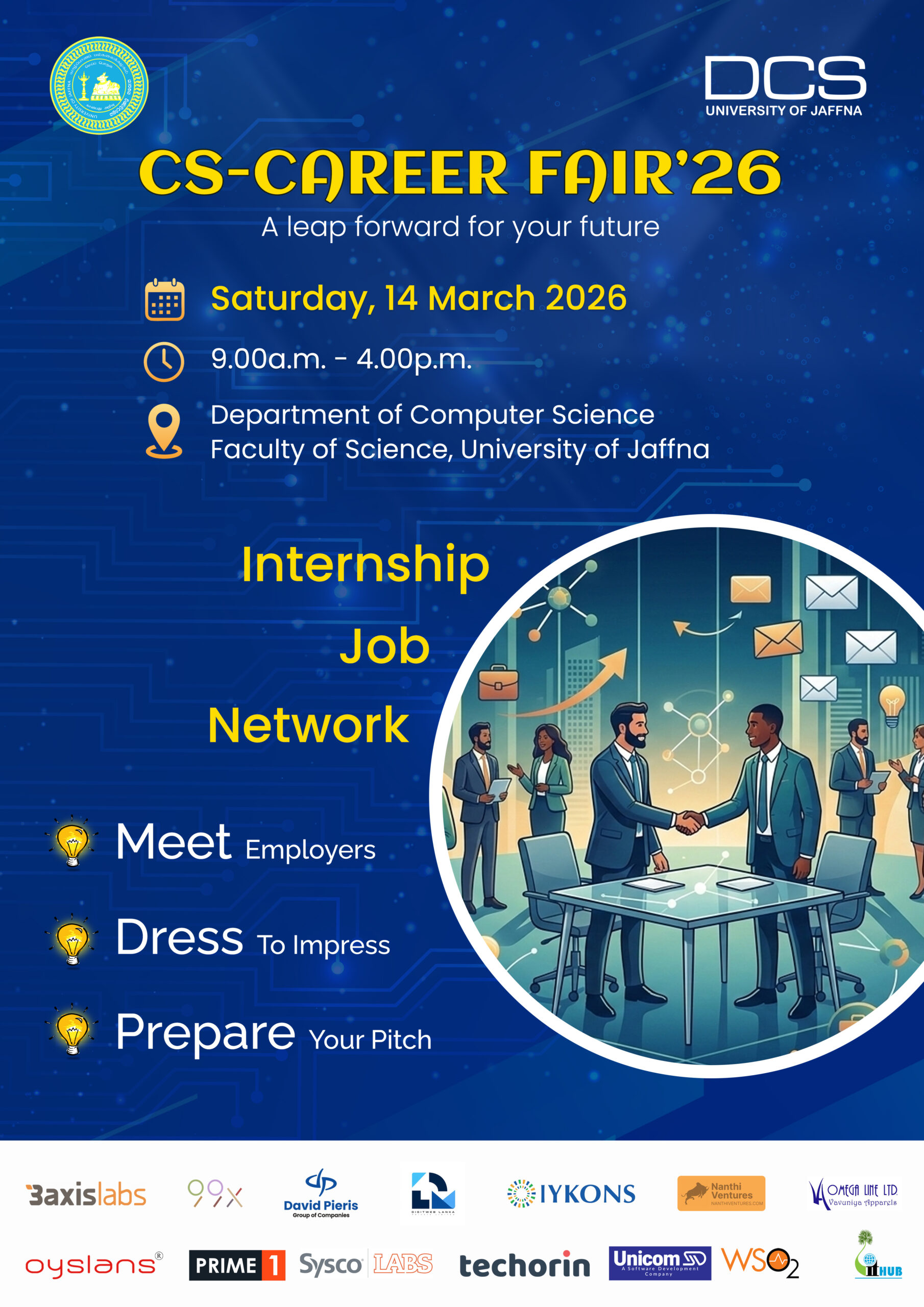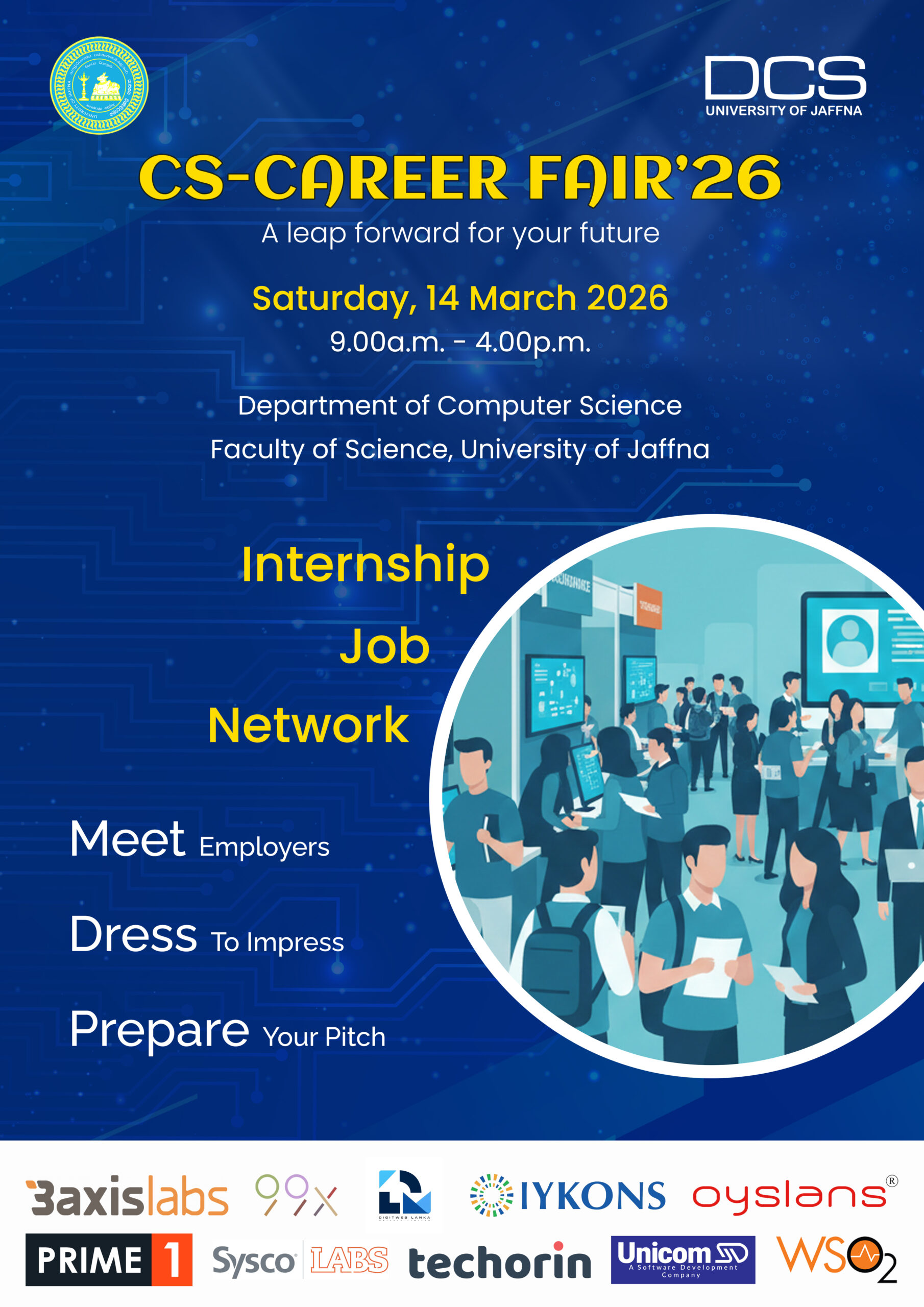 The Department of Computer Science (DCS) at the Faculty of Science, University of Jaffna, wishes to organize the CS-Career Fair’26, scheduled for Saturday, March 14, 2026. This event will be hosted in a hybrid mode at DCS, allowing participating companies to join either via Zoom or in person at the Department of Computer Science, University of Jaffna. Students attending the career fair will be present in person. If a company opts to connect online, they will do so to a designated stall at the Department of Computer Science, University of Jaffna, where students will attend in person.