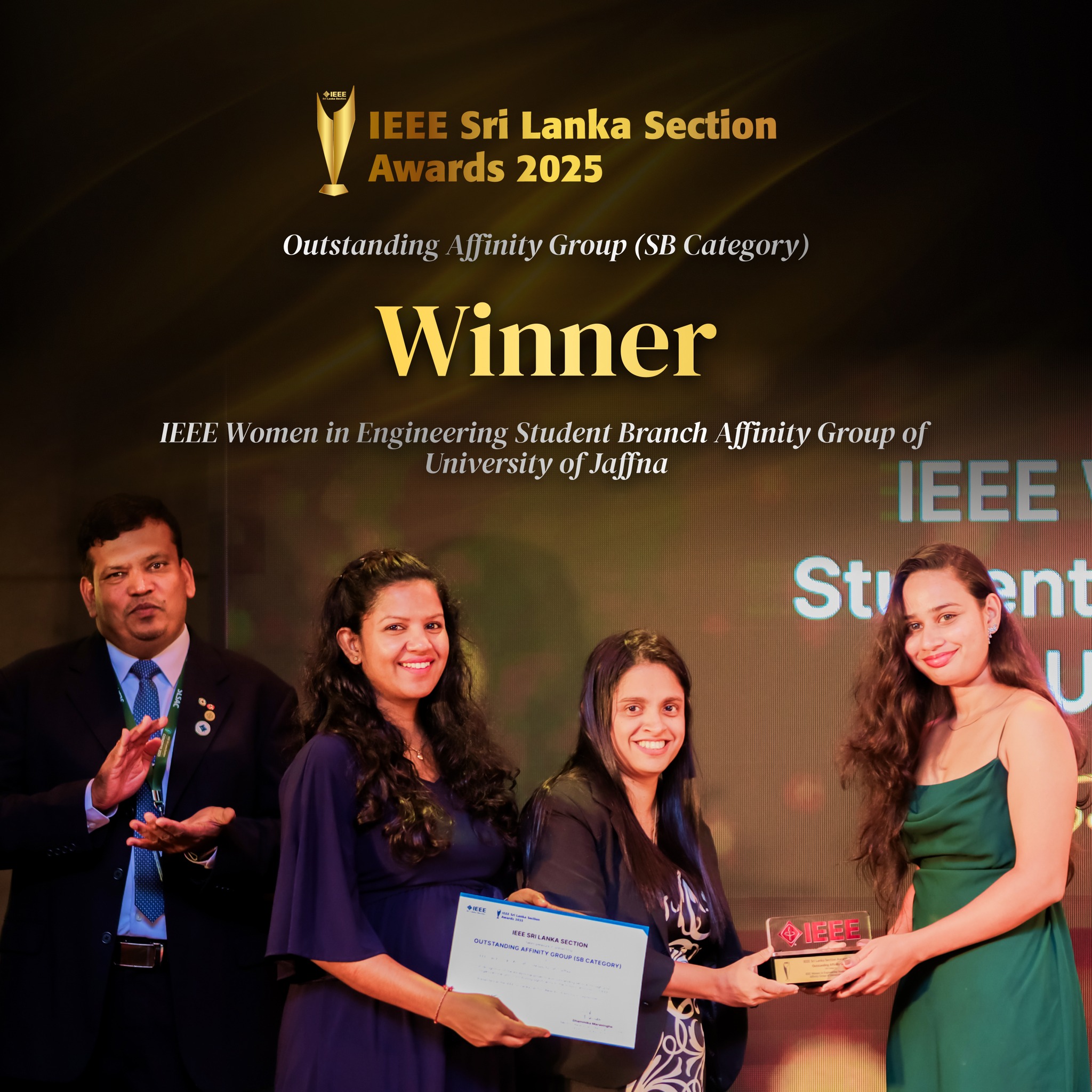 Awarded to the IEEE Women in Engineering (WIE) Student Branch Affinity Group, University of Jaffna, in recognition of its exemplary activities carried out during 2025, under the advisorship of Dr. (Ms.) J. Samantha Tharani.